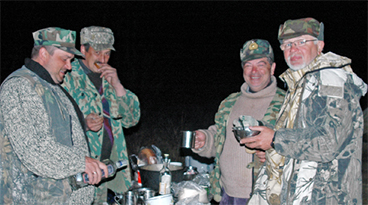 Вечерний ужин. Потом долгие посиделки у костра, возлияния под вкуснейший плов из гуся и общение.